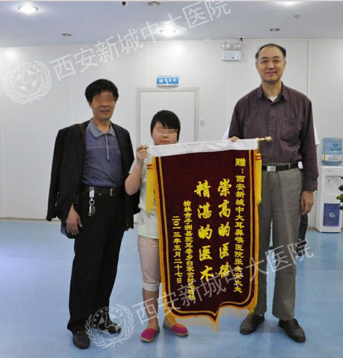 经张教授亲自主刀手术,胆脂瘤切除术后,听力下降的症状也随之消失。手术后,据出院病历显示,马艳无右耳闷胀堵塞感,无听力下降、耳闷,无耳流脓,无耳痛,头晕、头痛等不适。为了感激张教授,马艳随同父亲不远千里,特意从榆林老家赶来西安新城中大耳鼻喉医院,与父亲一起亲自将锦旗送到张全安教授手中,称赞张教授“精湛的医术,崇高的医德。