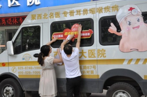 高考当天,西安新城中大耳鼻喉医院“爱心直通车”在市区主要干道穿行,考生在路上看到贴有中大医院“高考爱心直通车”标志的车辆,如有需要可凭准考证上车,司机会安全准时将考生送到考场。除了在市区主干道的机动爱心直通车外,中大医院还将设立点对点的免费接送服务,如家庭住址偏僻,出行不便等情况,或者考生因为身体原因不方便乘坐公交车的,都可以报名预约搭乘中大医院“高考爱心直通车”。