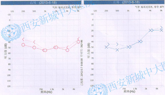 杜爱国的入院听力检测记录:右耳气导76dB,骨导15dB;左耳气导65dB,骨导25dB