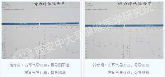 罗女士,32岁,西安人,耳鸣病史一年零三个月,伴有听力下降,在西安市某医院接受多次治疗均告无效,听力不见好转,耳鸣持续存在,症状时好时坏。罗女士心急如焚,在报纸看到西安新城中大耳鼻喉医院有新研发的治疗方法,遂来院求诊。国庆期间入院后经电测听、复合式耳鼻咽喉内窥镜检测等检查,被诊断为"神经性耳鸣"、"突发性耳聋"。