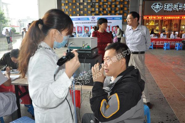 瓢泼大雨,并未浇灭卫生系统医务人员义诊的热情。昨日一早,在万达广场的屋檐下,西安中大耳鼻喉医院的义诊阵容,吸引了附近的居民。记者在现场了解到,除了可以量血压和测血糖等常规项目外,西安中大医生在现场为居民开展耳鼻喉内窥镜检查等项目,并为市民现场宣教耳鼻喉日常保健知识。