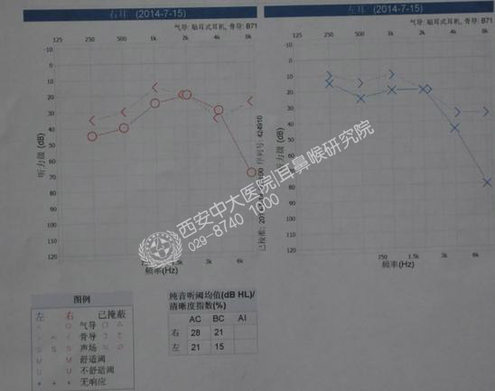 2014年7月15日,经过耳内镜检查发现宋先生耳膜凹陷,引起耳鸣的病因是实际上是重感冒后咽鼓管堵塞。特为宋先生进行纯音听力测试,纯音听阀值显示:右耳(气导28,骨导21)左耳(气导21,骨导15),经医生诊断为:感音神经性耳鸣。西安中大耳鼻喉医院副主任冯亮一起为宋先生的检查报告单进行分析病情,探讨治疗方案。