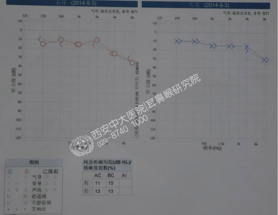 宋先生在西安中大耳鼻喉医院经过三个疗程后,耳鸣近乎消失,满意出院。9月3日,宋先生再次来到医院进行复检,纯音听力测试显示宋先生右耳(气导11,骨导15),,左耳(气导13,骨导13)。比前次治疗前检查时的结果明显有好转,听到医生告知的好消息,宋先生万般激动的说道:还好我没有放弃,现在我会好好注意保养身体,感谢西安中大耳鼻喉医院对我的帮助,感谢教授的妙手回春!