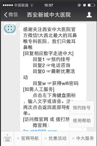 据悉,西安中大耳鼻喉医院是西安市与腾讯微信合作的医院,同时也是西安市首个开通微信支付的医院。截至目前,微信智慧医疗解决方案已经覆盖的地区包括北京、上海、广东、江苏、浙江、湖南、湖北、四川、重庆、云南、海南等地,近100家医院上线微信全流程就诊,超过1200家医院支持微信挂号,服务累计患者超过300万。