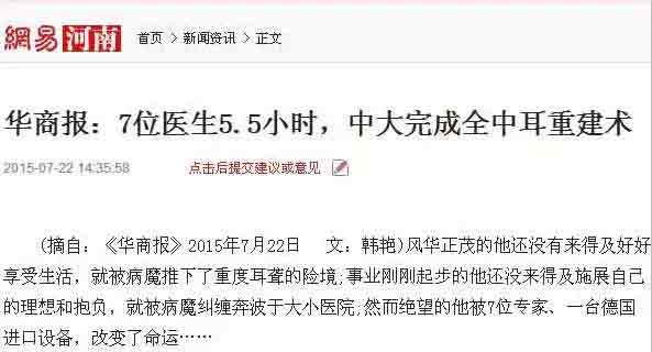 (摘自:华商报2015年7月22日 文:韩艳)风华正茂的他还没有来得及好好享受生活,就被病魔推下了重度耳聋的险境;事业刚刚起步的他还没来得及施展自己的理想和抱负,就被病魔纠缠奔波于大小医院;然而绝望的他被7位医生、一台 进口设备,改变了命运……