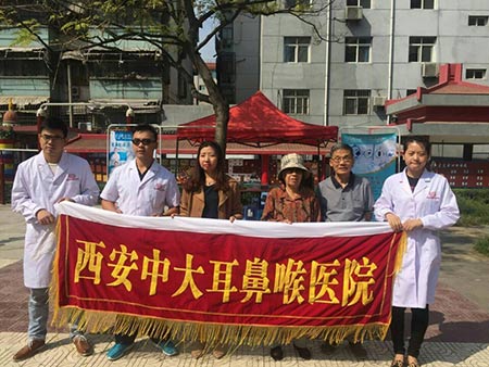 9月25日,农历八月十三,周五,艳阳天,上班族即刻将放假,家庭马上将迎来温馨团聚。西安中大耳鼻喉医院的医护人员,依然在进行着义诊活动。