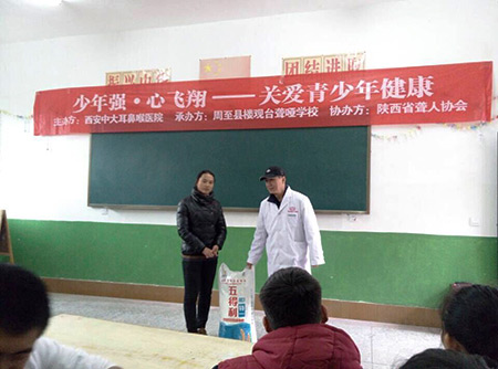 “关注特殊儿童,传递爱心之举”。11月10日,由陕西聋人协会牵头,西安中大耳鼻喉医院志愿者一行在陕西省聋人协会贾双登主席的陪同下,前往周至县楼观台聋哑学校开展“少年强·心飞翔--关注青少年健康”活动。中大志愿者们对学生进行爱心授课,并向学校捐赠水杯、鼻子宝宝公仔、米面等“爱心物资”,给聋哑儿童送去关爱和温情。