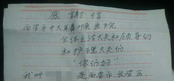 据何奶奶邻居张大爷透露,自她老伴离开后以前挺开朗的一个人,很少再看到她笑的这么开心了,回到家跟我们这些邻居唠嗑时总不自觉的说到西安中大耳鼻喉医院的来长荣教授,说他治好了自己的耳朵,真的很感谢!这不,还特意亲笔写了封感谢信。