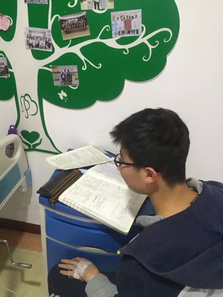 小闫一边输液,一边认真复习功课,妈妈在一旁陪着